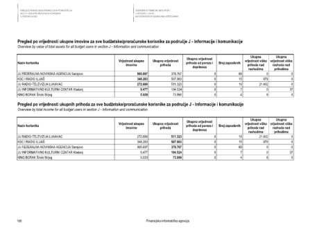 Pregled po vrijednosti ukupnih prihoda za sve budžetske/proračunske korisnike za područje J - Informacije i komunikacije