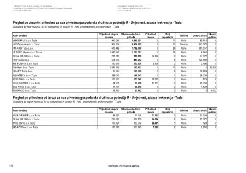 Pregled po prihodima od izvoza za sva privredna/gospodarska društva za područje R - Umjetnost, zabava i rekreacija - Tuzla