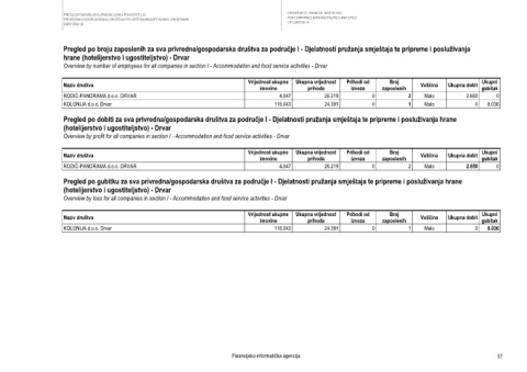 Pregled po dobiti za sva privredna/gospodarska društva za područje I - Djelatnosti pružanja smještaja te pripreme i posluživanja hrane